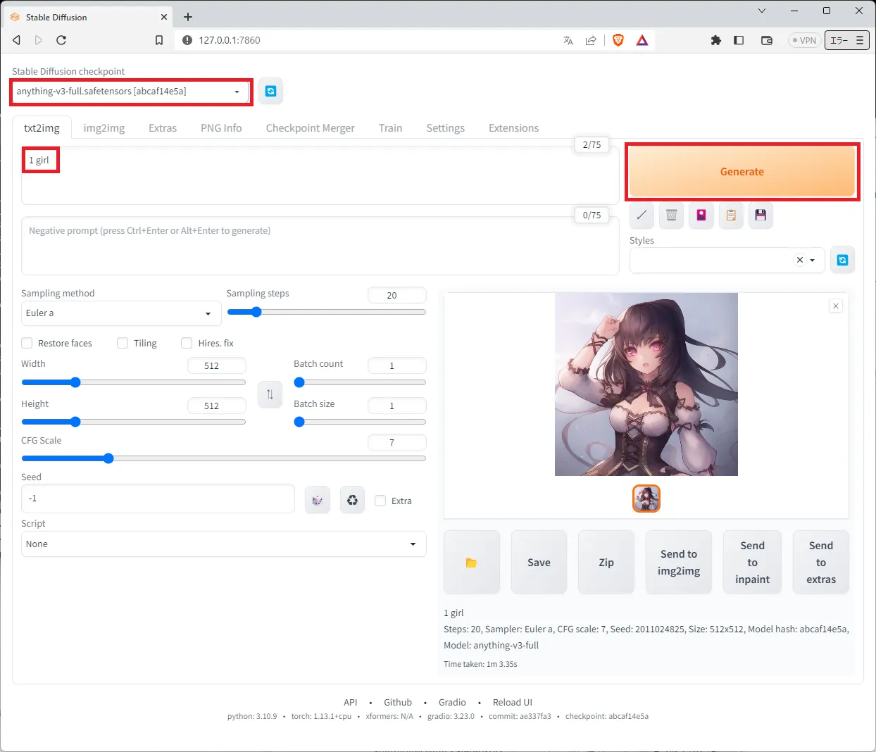 プロンプトに「1 girl」と指定してGenerateをクリックしてみます。